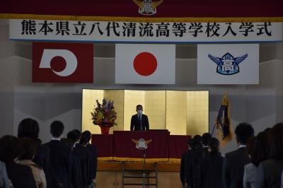 4月8日(木)午後、本校体育館において第10回入学式が行われました。各クラスの担任先導のもと、真新しい制服に身を包んだ新入生が入場しました。新入生は担任からの呼名に元気よく返事をし、清々しさとエネルギーを感じることができました。飯田校長による入学許可により、第10期生となる135名の新入生が八代清流高校の一員となりました。