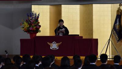 校長式辞では歓迎の言葉とともに、心がけてほしいこととして、「夢や志を持ち、自分の可能性を信じ、失敗を恐れず、粘り強く挑戦すること」を挙げられ、「特に大切にしてほしいのが、同級生や先輩」、「同級生や先輩方と共に夢に向かって学んでほしい」と述べられました。