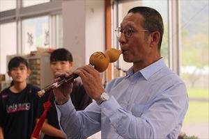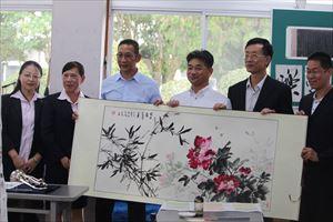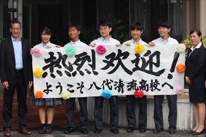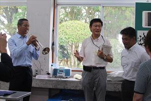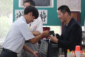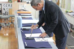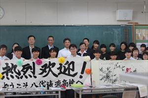 8月23日(金)、北海市図書館交流団の方々が5名八代清流高校に来校されました。図書館を視察され、いくつか質問をされていました。その後、書道室に移動さし、書道部の練習風景を見学されたり、一緒に書道をして楽しまれました。また、生徒へ中国の歴史についての説明をしていただきました。団長さんが「北国の春」をトランペット演奏されました。それにあわせて鬼塚教頭が歌をうたわれ、なごやかな雰囲気になりました。最後にみんなで記念撮影を行い、とても良い交流の機会になりました。