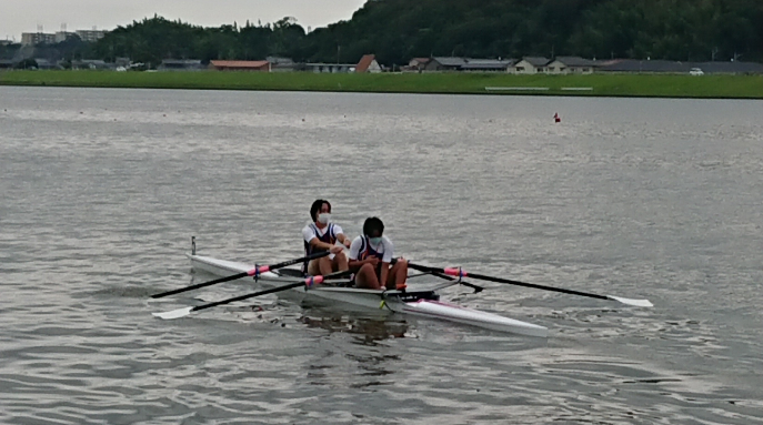 令和3年7月10日(土)~11日(日)、福岡県遠賀川漕艇場で国民体育大会九州ブロック大会に3年宮山さん、清水さんが少年女子ダブルスカルで出場しました。大会直前の大雨や天候不良で、コースコンディションがかなり悪化し、苦手とする波風に苦労するレースとなりました。予選では他クルーのハプニングでレース中断となり、その後も流れに乗れず敗者復活戦に出場しました。レース前半はリードするものの力及ばず大きなうねりと波にのまれ敗退してしまいました。国体出場は逃してしまいましたが、新型コロナ感染拡大中の時期に、大会が実施されたことに感謝したいと思います。次は8月のインターハイです。気を引き締めて頑張りたいと思います。応援していただいた皆様ありがとうございました。