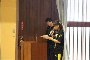 次に、全国大会へ出場するアーチェリー部と放送部の推戴式を行いました。各部の代表が全国大会へ臨む抱負を述べ、やる気に満ち溢れる挨拶はとても頼もしく感じられました。アーチェリー部、放送部が全国で活躍できるよう生徒会長、校長が激励の言葉を送りました。