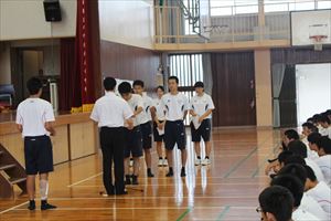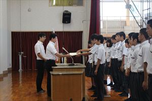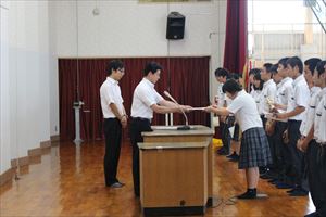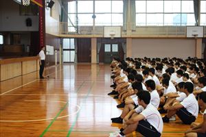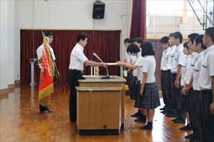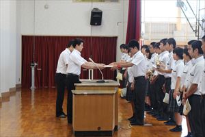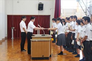 推戴式の後は、教務主任、進路指導主事、生徒指導主事から夏休みの過ごし方についての講話がありました。先生方の話や注意はしっかりと生徒の胸に届いている様子でした。