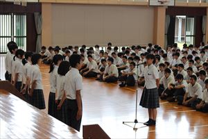 掃除後に、全校集会を行いました。最初に平成27年度第1回表彰式を行いました。代表生徒が、校長から賞状や優勝旗、トロフィーを受け取りました。生徒の表情はとても凛々しく、誇らしげに見えました。周りの生徒からは、仲間の活躍や健闘を喜び称える大きな拍手が沸き起こりました。また、校内の美化コンクールの表彰も行い、懸命に掃除に取り組んでいるクラスが表彰されました。