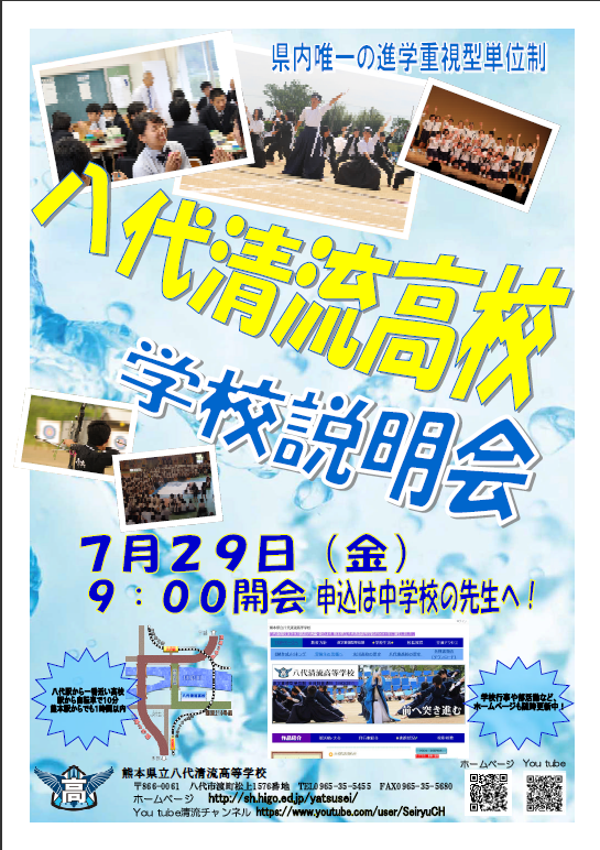 7月29日(金)の学校説明会に、たくさんの方々にお越しいただけることを心から期待しております。本校生徒・職員一丸となって準備してお待ちしております。ぜひ、八代清流高等学校の学校説明会にお越しください。