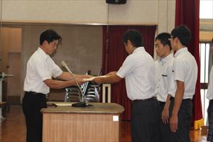 その後、表彰式では、活躍した生徒に大きな拍手が送られました。熊本地震にも負けず、環境が整わない中、結果を残してくれたことに皆が喜びました。終業式では、学校長から「熊本地震から多くのことを学び、命があることや日常生活の大切さを知ることができました。そして、学校の存在について考えるきっかけにもなりました。学校は安全な生活場所であり、学舎でなければなりません。生徒へ様々な社会性や危機管理、教育を伝えます。皆さんは、ルールを尊重し、身の回りの環境を整え、多くの知識を身に付け、自ら考えて行動することが大切です。一日一日をしっかりと生きてください。」と伝えられました。