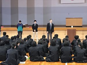 始業式が終わり、新しい年度に関わる校務運営委員の先生方の紹介と3年、2年、1年生の担任、副担任の紹介がありました。生徒達から大きな拍手があがり大いに盛り上がりました。そして、教務主任、進路指導主事、生徒指導主事の先生方から新しい年度に向けて講話がありました。教務主任の先生からは、考査と新年度の行事ついて、進路指導主事の先生からは、未来の自分を想像し、「なりたい自分」に近づくために時間を大切にすることについて、生徒指導主事の先生からは、挨拶、校則や整容の重要性と携帯電話の使用について話がありました。