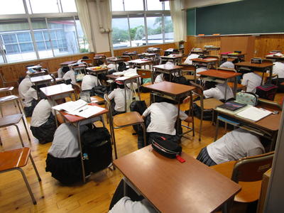 安全確保のため素早く机の下に身を隠す生徒たち