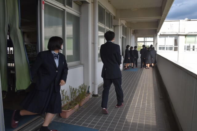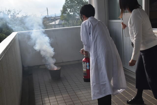 消防士の方の講評も頂き、代表生徒による消火体験も行いました。もしもの時に落ち着いて行動できるよう、今後もいろいろな条件を変更しながら避難訓練を実施したいと思います。