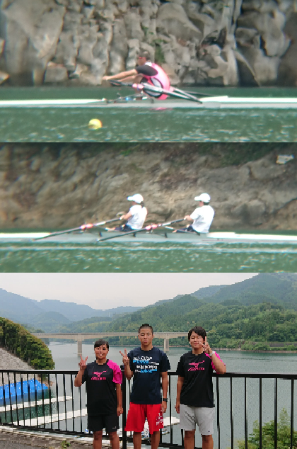 6月1~2日菊池市班蛇口湖で令和元年熊本県高校総体ボート競技が行われました。男子シングルスカル(1年次 藤原くん)、女子ダブルスカル(1年次 宮山さん、清水さん)の2クルーで参加しました。男子シングルスカルでは1年生の参加は藤原くん一人。敗者復活戦では3年生の選手に先行する素晴らしいレースを見せましたが後半の減速で惜しくも敗退。女子ダブルスカルは7回目の乗艇。初心者として初のレースを無事に漕ぎきり敗者復活敗退という結果になりました。たくさんの卒業生や保護者の皆様の応援ありがとうございました。本年度のインターハイは逃しましたが全国選抜を目標に3人で頑張ります。