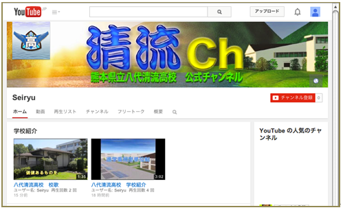 八代清流高校では、学校の魅力や最新の情報を発信する新たな手段として、動画共有サービス「YouTube」上に八代清流高校公式チャンネル『清流Ch』を開設しました。YouTubeは、誰でも手軽に動画を公開することができ、インターネット接続環境があれば無料で視聴することができるため、目にする機会も増えてきています。ホームページやパンフレットだけでは伝わりにくい情報を、YouTubeを通じて紹介していきたいと思っていますので、どうぞご覧ください。YouTubeアカウントをお持ちの方は、ぜひチャンネル登録をお願いします。動画は今後、どんどん増やしていく予定です。