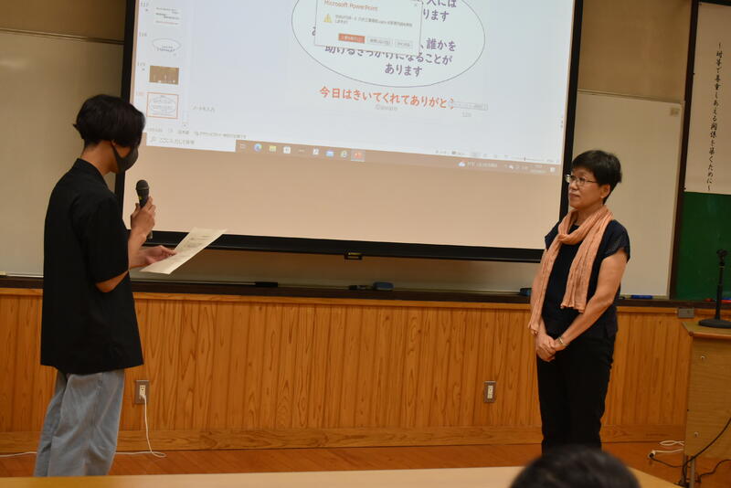 今回はNPO法人『リ・スタートくまもと』から富永智子先生が講師として来られ、デートDVに関することや、「性」に関することなどを教えていただきました。中には、DVの状況とそれが改善された状況を劇で示す場面があり、その際は本校職員とNPO法人の方が前に出て劇を行うなど、生徒も刺激になったのではないかと思います。