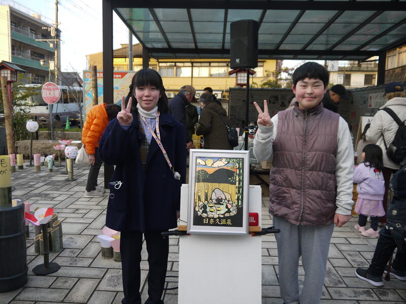 最終日である3月3日(日)には、イベントの一つとして、いこいの広場で「ひなぐ竹灯篭」の展示が行われました。会場では、本校の岡下さんが「総合的な探究の時間」に作成した「日奈久温泉観光プロジェクト」の切り絵作品が展示されました。岡下さんは昨年「9月は日奈久で山頭火」の絵手紙コンクールで大賞を受賞しており、これを契機として、日奈久の観光振興に、自分自身も一役担うことができればと考え、作品を制作してきました。