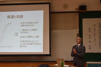 9月24日(木)医療法人榮邦会池田クリニックの池田稔医師を講師に招き性教育講演会を行いました。講演では、「大人の身体の基準」「身体の仕組と手入れの方法」「性の男女平等とは」「性」=命のつなぎ方 以上4つのテーマに沿って説明がありました。医者としての専門的な見地から、男女に係る性等について、力強く説得力のあるお話を聞きくことが出来ました。本日は遠方から、遅い時間までの講演ありがとうございました。