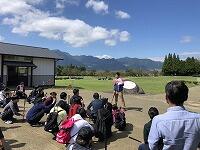 当日は、天候にも恵まれ、最初に到着したのは「一心行公園パークゴルフ場」。「パークゴルフ」は、ミニゴルフの一種で、1983年、公園で幅広い年代の人ができるスポーツとして考案されたもので、ルールは、ほぼゴルフと同じです。生徒職員共に初体験の人が多かったにもかかわらず、やっているうちに慣れてきて、カップインがある度に歓声が上がり、パークゴルフの面白さを堪能することができました。