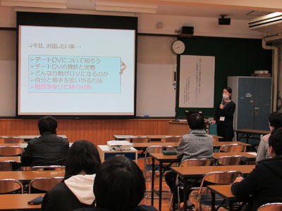 12月3日(木)DV未然防止講演会を行いました。講師の高濱先生より「DV」、「デートDV」の二つのことについてお話いただきました。特に高校生の年代でも起こる可能性がある「デートDV」については重点的に話していただき、相手を尊重し合う気持ちが大切だということを学びました。