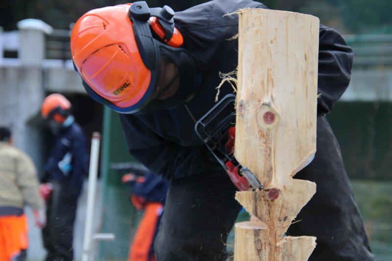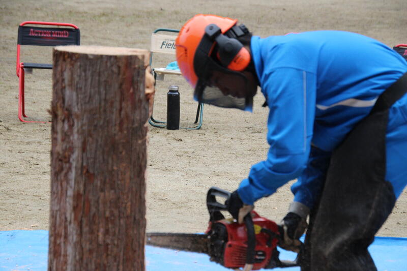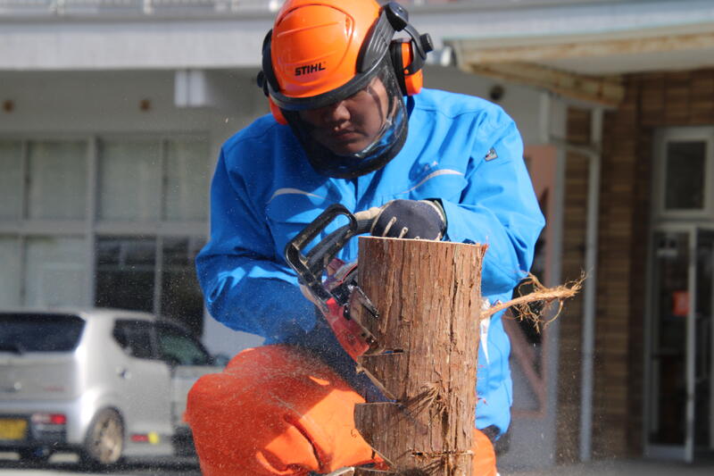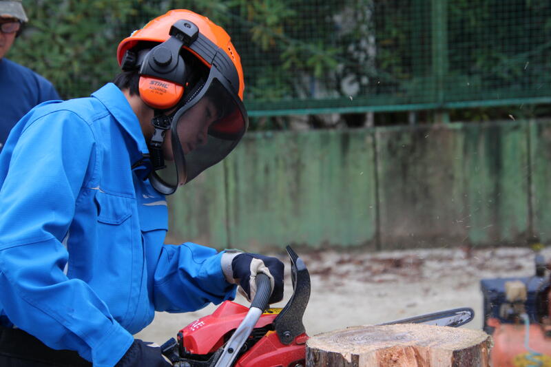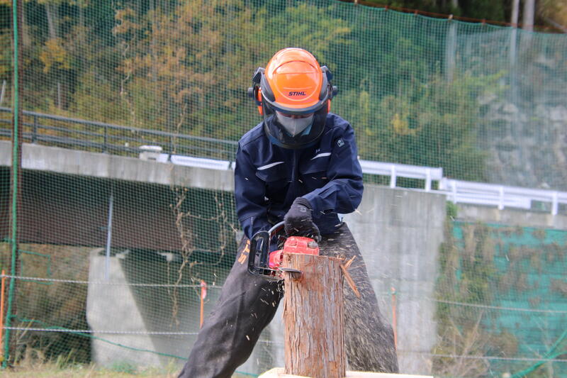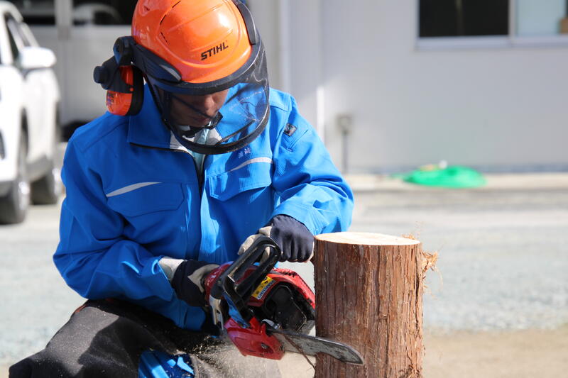 チェーンソー操作の基本について説明があった後、実際に丸太を切ってみたり、伐採時と同様の切り方にもチャレンジしてみました動物