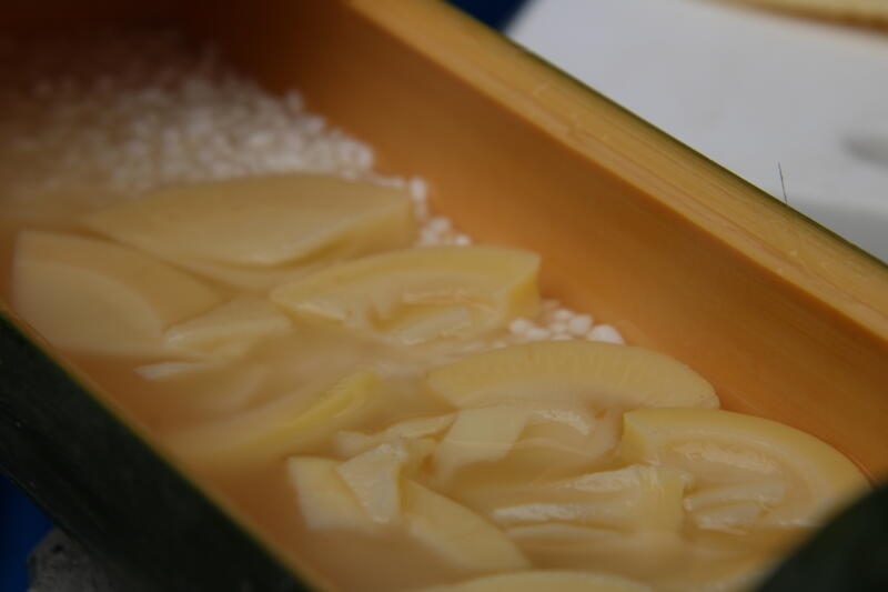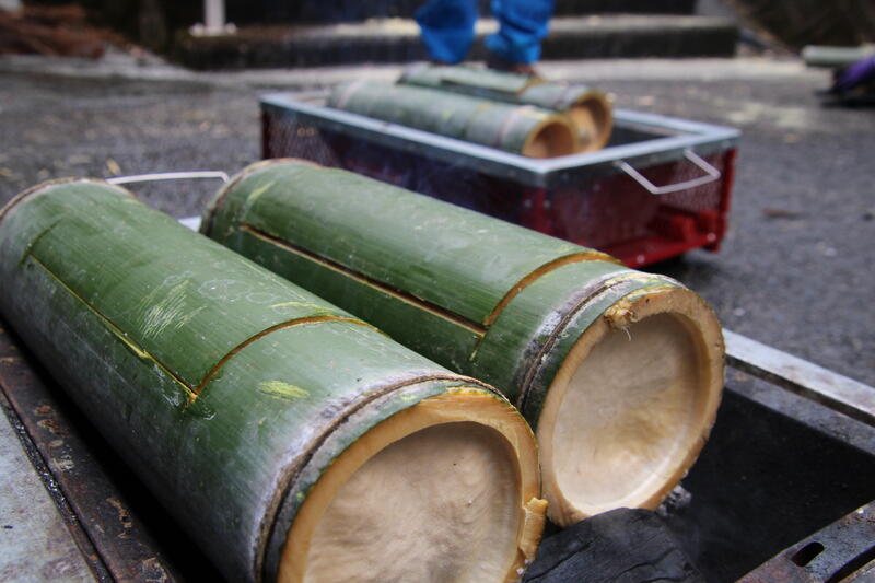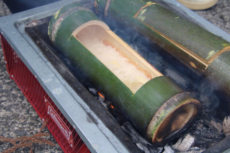 竹を切り、節の部分をうまく活用して1人前の飯盒を作り、フタをしてじっくり炊いていきますキラキラ筍も入れてタケノコごはんを作りましたひらめき