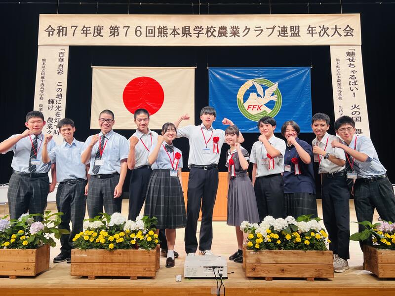 先週、19日(木)~20日(金)に植木文化ホールにて行われた「令和7年度第76回熊本県学校農業クラブ連盟年次大会」に本校を代表して11名の生徒が出場しました!