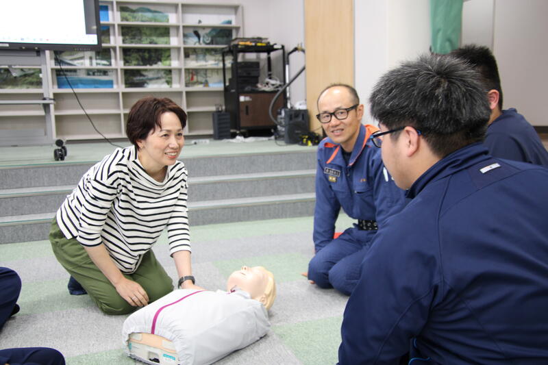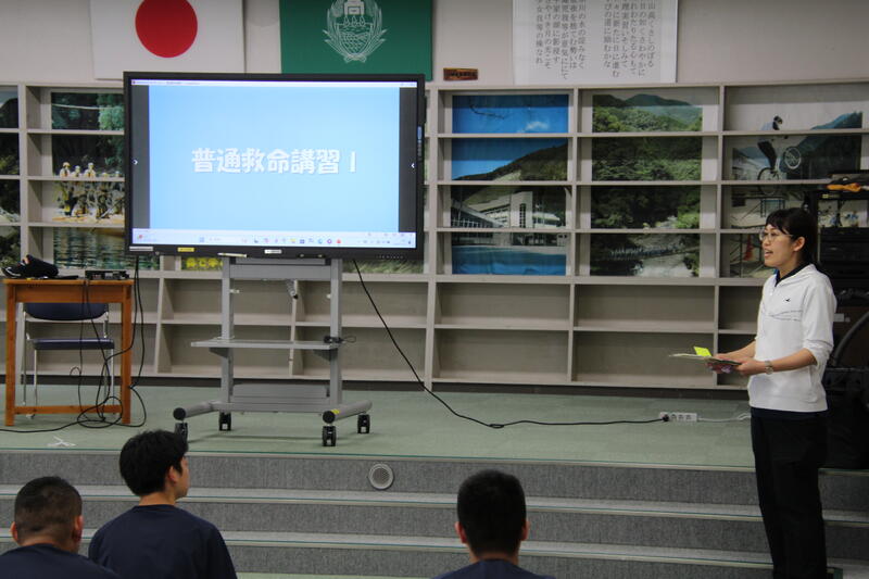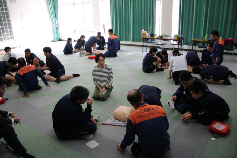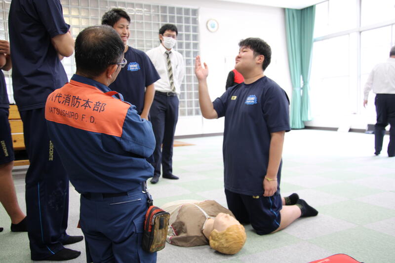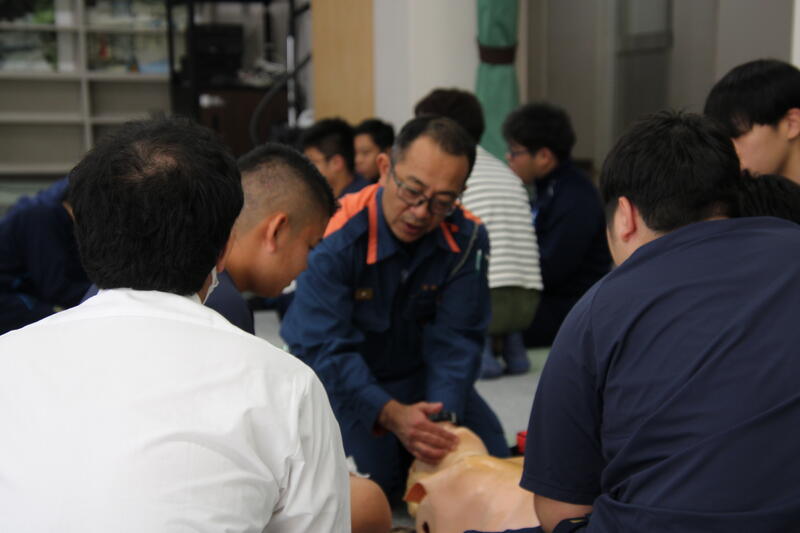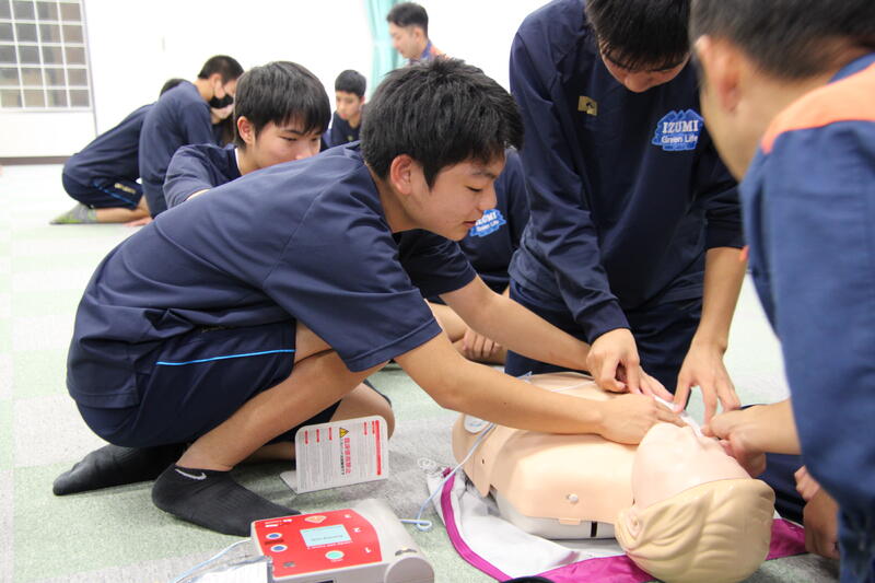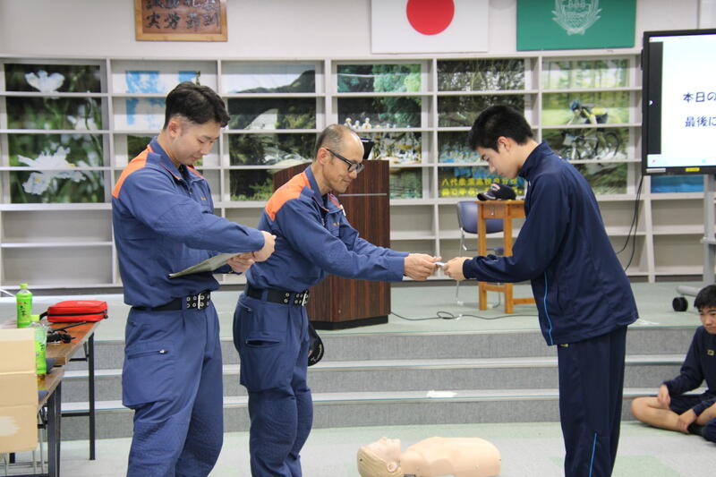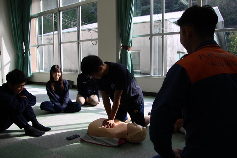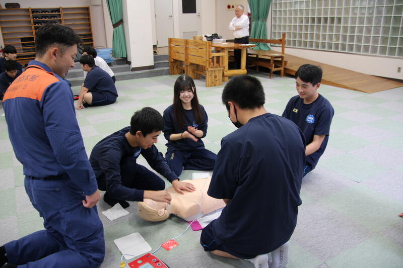 2年生と職員が参加し、胸骨圧迫やAEDの使い方など緊急時における対処方法を学びましたキラキラ