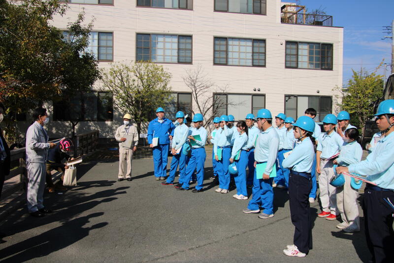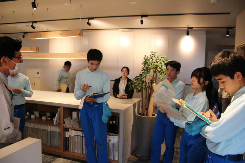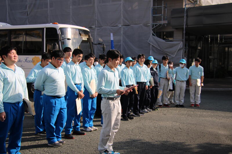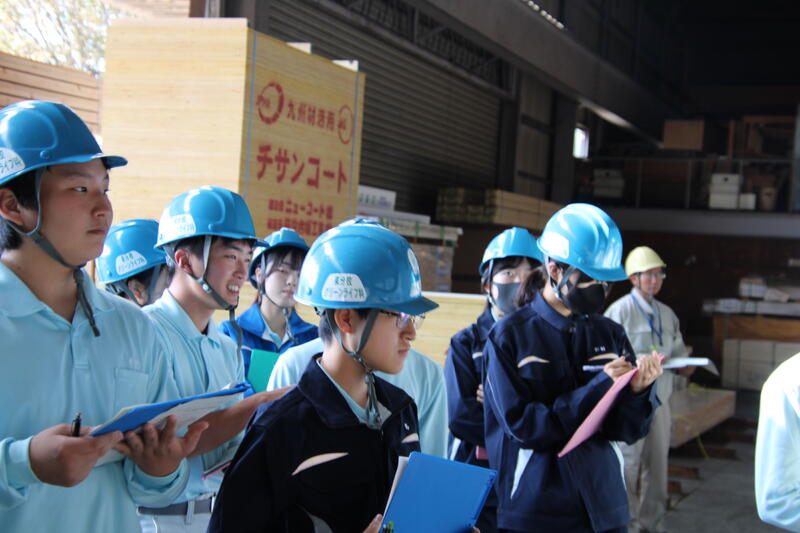 学校で説明があった後バスで移動し、午前中は肥後木材(株)様、午後は新産住拓(株)様にて研修を行いました晴れ
