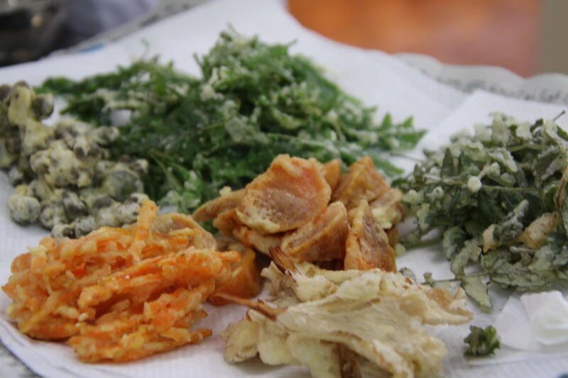 山菜の天ぷらではむかごやさんしょうの葉、なめこ、そして柿も揚げていきます了解