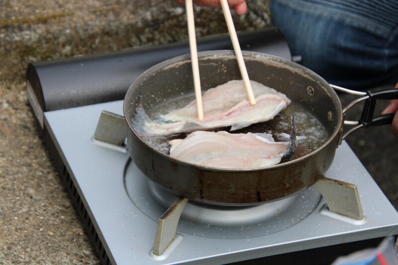 使用するヤマメは小ぶりのものは丸ごと、大きめのものは3枚におろして揚げていきます了解