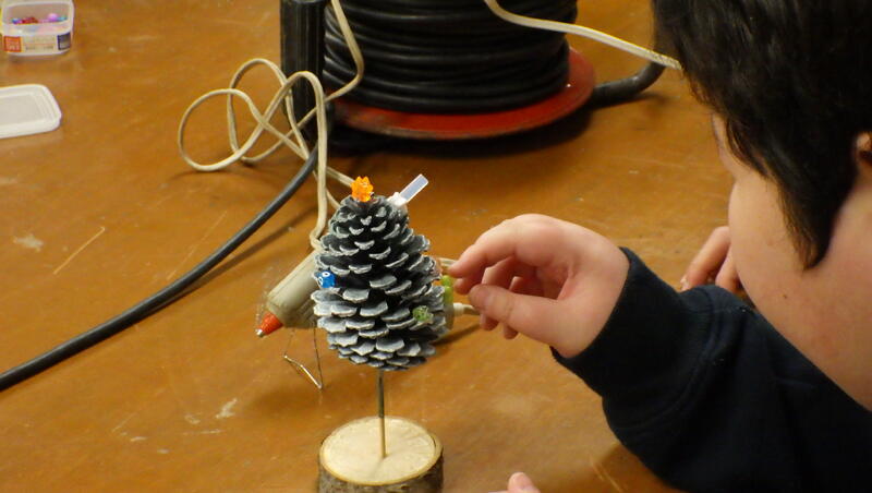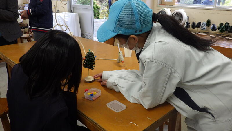 17日(月)に泉小学校の生徒さんをお招きして、松ぼっくりを使ったクリスマスツリー作りを行いましたハート