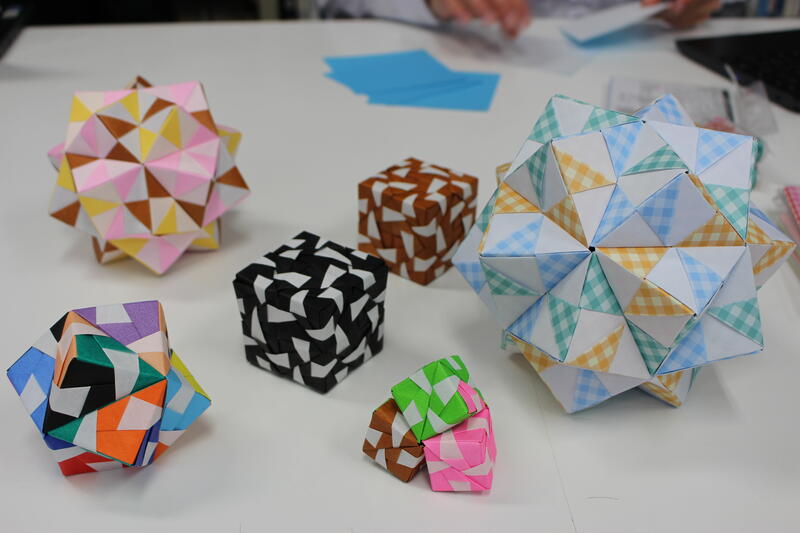 きれいに見せるためにはどんな色を組み合わせればよいか、どの方向で折って重ねていけばよいか、担当教員も試しに作ってみましたがなかなかの頭の体操になりました急ぎ