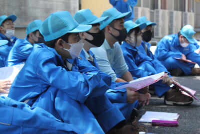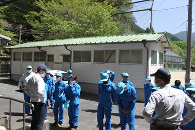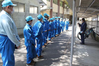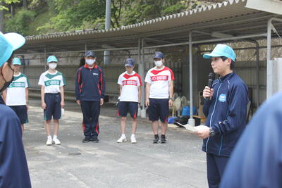 ご厚意でお借りした、駐車上で各学年の自己紹介と目標発表および職員の自己紹介が行われました