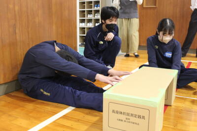 今日の体育は、月末に行われる新体力テストに向けて、反復横跳びと長座体前屈の練習を行いました