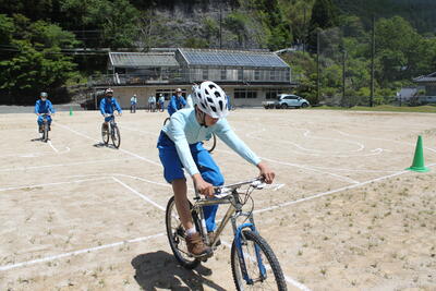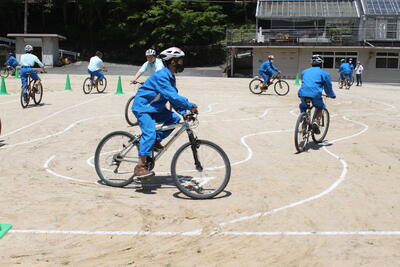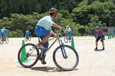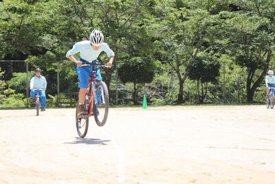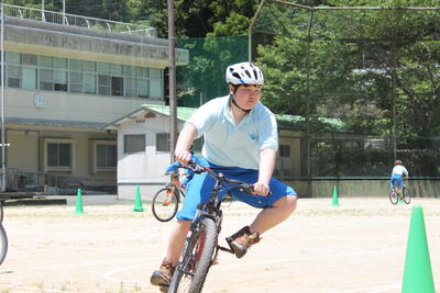 グラウンドに作られたコースを普段の自転車とはひと味違う乗り方で走る1年生