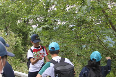 矢山のふもとに到着すると、各グループごとに3年生が中心になって矢山の植物の説明を行います