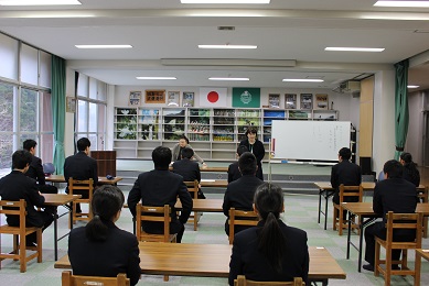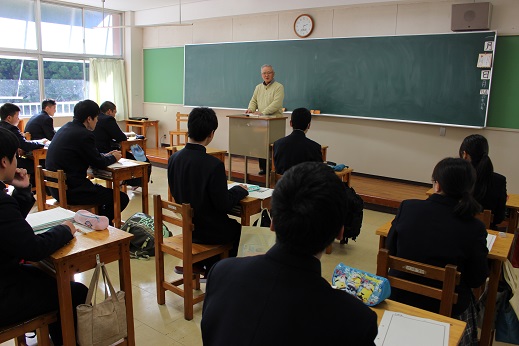 3年生が分校に登校する時間も残りわずかです。その3年生に向けた講演会が行われました。講師の先生は、グリーンライフ科設立当時の教頭先生である、尾方徳一先生です。学科設立の話や生徒たちが頑張り続けた結果、分校が存続したことなど、生徒たちは、自分たちの分校生活を振り返りつつ話を聴いていました。また、先生の人生経験も交えてお話され、分校で学んだ内容は進路先での生活に活かすことができるので今後も頑張ってほしいとお話いただきました。先生の優しい話し方で、とても和やかな時間を過ごさせていただきました。