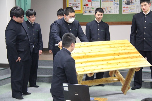 1月29日(月)グリーンライフ科3年生が課題研究発表会を行ないました。木材工芸班は《木を活かしてモノを作る~テーブル製作~》を発表し、野外活動班は《MTB活動、カヌー活動、チェーンソー・刈り払い機実習のマニュアル作り》について発表しました。