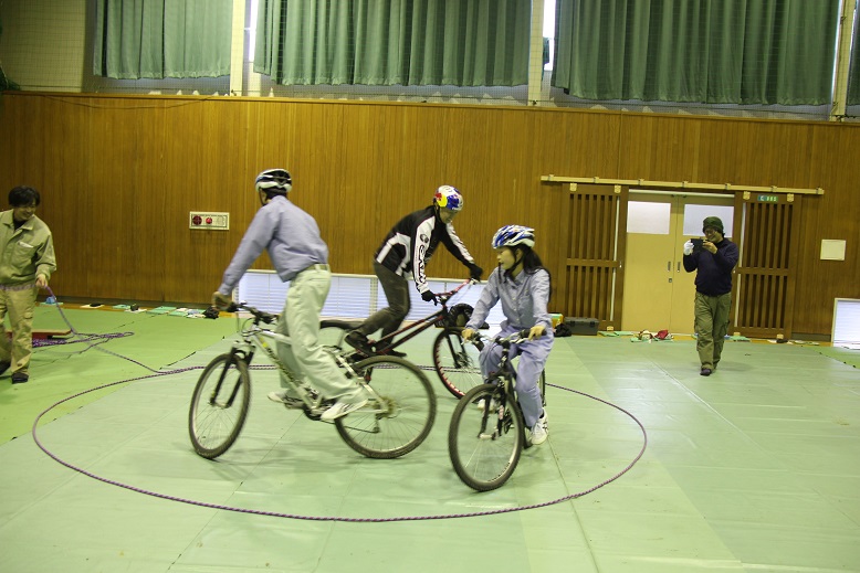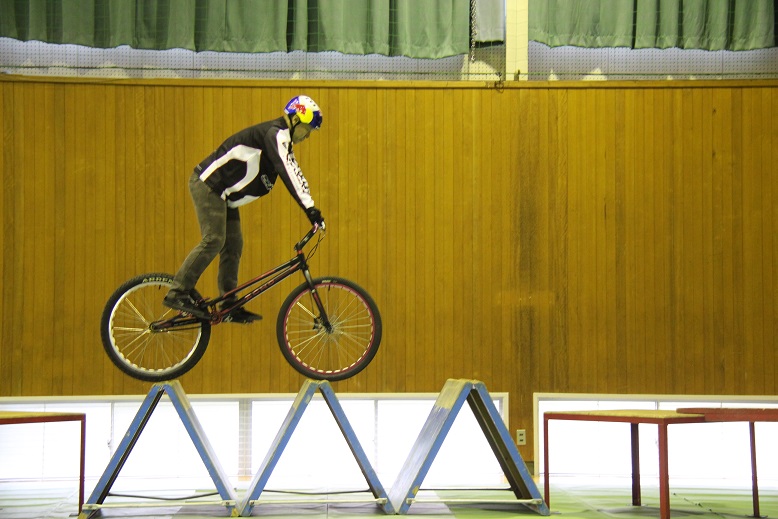 岩や斜面等の自然地形や人工の構造物を乗り越えていくマウンテンバイクトライアル講習が12月4日(月)に行なわれました。講師としてNao氏(松山直樹 様)を迎えて、当日は雨天の影響もあり、体育館で実施しました。2・3年生を対象に走行や静止技術の向上につながりました。またMTBパフォーマーのNao氏による実演では、生徒たちも驚きと凄さを実感していました。
