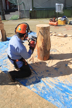 その後、チェーンソーで丸太に字を掘る実技指導をしていただき、簡単な内容に思えましたが、カーブが上手く掘れず悪戦苦闘していました。中々、見ることができないチェーンソーアートに体験することができ良い経験になったと思います。