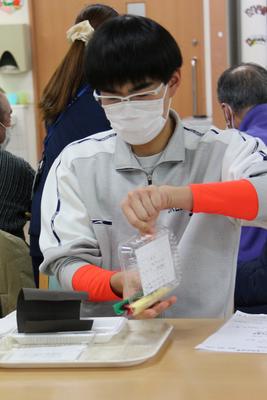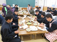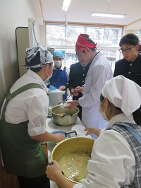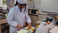 しゃくなげ会代表・八代食の名人 高尾扶佐子さんのご指導で、グリーンライフ科3年生3人がもみじ(鹿)カツ丼、そばだご、柚子砂糖漬け、吸い物づくりに挑戦しました。