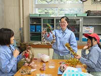 12月11日(火)に泉小学校との交流学習を行いました。分校の生徒2年生7名と小学校1,2,3年生合計20名と一緒に松ぼっくりのクリスマスツリーを作りました。あいにくの雨模様でしたが、木工室のなかでは、楽しそうにツリーを作る小学生の姿を見ることができ、分校生も丁寧に教えていました。松ぼっくりのクリスマスツリーは12月15日(土)に開催される学びフェスタやつしろでも分校生が教えますので、興味のある方は是非お越し下さい。