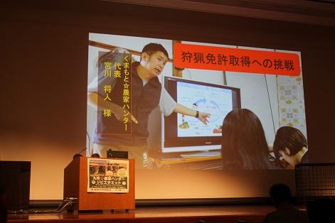 1月12日(土)熊本学園大学で行われた第6回九州☆農家ハンタージビエサミットに参加してきました。高校生の取り組みとして午後の部でのプロジェクト発表とパネルディスカッションの代表として参加してきました。今回のサミットには産学官と職種を越えて多くの方々が参加されていました。その中で、泉分校の取り組み(鳥獣害対策と鳥獣の利用について)発表することができ、多くの方々に活動内容を知っていただくことができました。生徒達も緊張しながらも良い発表をすることができたと思います。お昼にはジビエ料理の試食があり、取材を受けるなど食べて学び情報発信をすることができました。