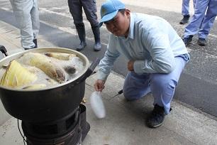 午後からは「水産研究センター」で柑橘ブリの研究について食品科学研究部の斉藤剛さんに説明をしてもらいました。その中で、ユズヤマメへの応用について様々なアドバイスを頂くことができました。その後、実際に柑橘養殖ブリと普通養殖ブリの食味試験を行いました。食してみると、柑橘の香りが口の中に広がりフルーツ魚がどんなものか知ることができ大変勉強になりました。