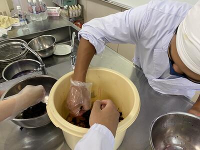 各自持参した野菜や果物を細かく刻み、すり潰します