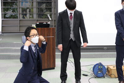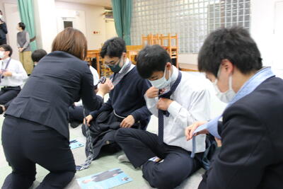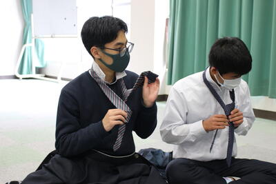 一通りスーツについて学んだ後は、みんなでネクタイ結びにチャレンジしました