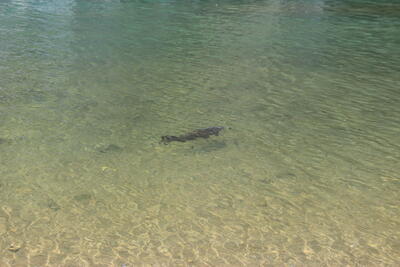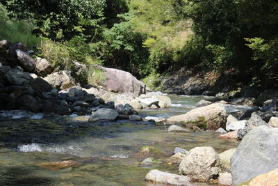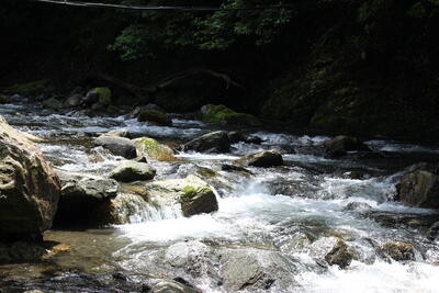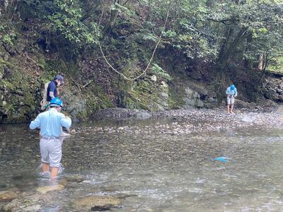 トレッキングシューズを脱いで靴紐を結び、肩にかけたら、ズボンの裾をまくり上げていざ川の中へ動物