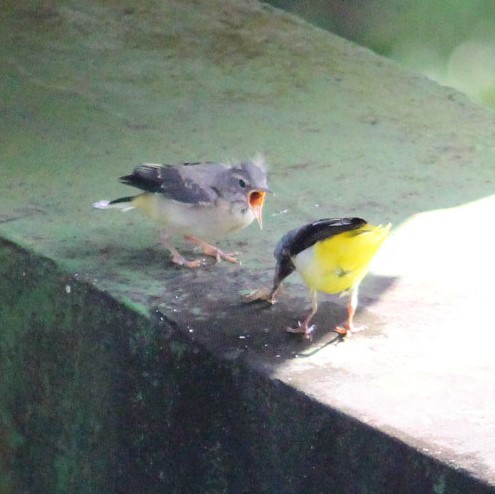 そうだとすると、先日は親鳥がエサを食べさせていましたが、巣立ちが近いのか、もう自分で採って食べなければならないのでしょうひらめき