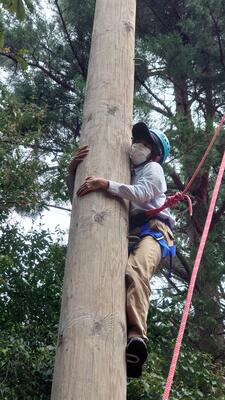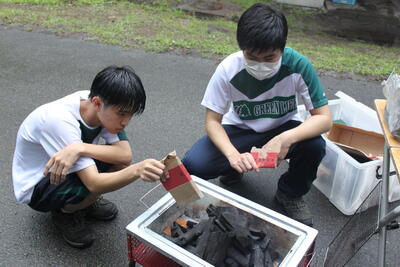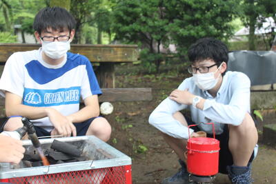 集団長縄跳びの風景はよくあるものの、丸太を切ったり、火起しのための小道具を準備したりする風景は、泉分校ならではですね王冠