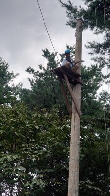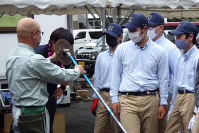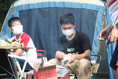丸太を切っていく単純なルールの競技ですが、各団に職員も加わり、さらに保護者チームも入れた4組で行う熱い闘いです雷テレビ局の取材も捗りますねひらめき