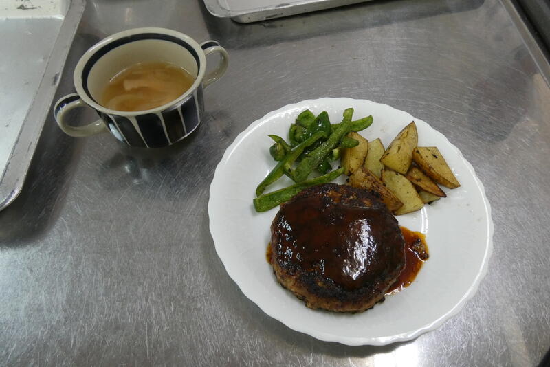 今日のメニューはたけのこご飯、すまし汁、鶏の照り焼きですキラキラ