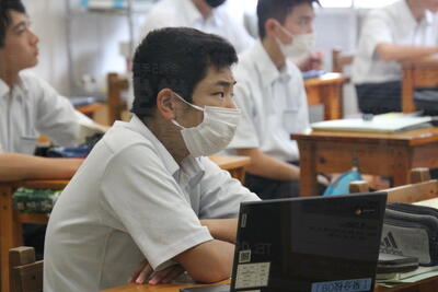 前方の電子黒板に映される内容や教科書の内容を真剣に見つめる1年生