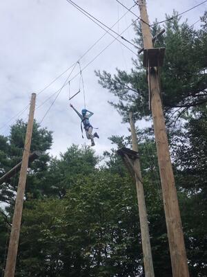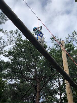 高さ10mほどの位置に設けられた丸太の一本橋を仲間と繋いだロープを頼りに渡ったり、ジャンプしたりするエレメントに挑みます