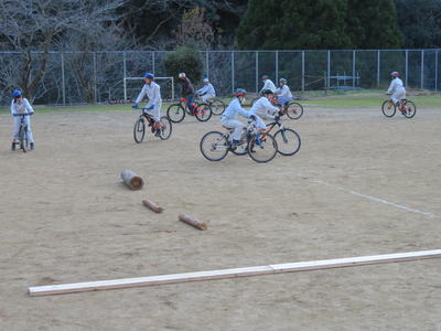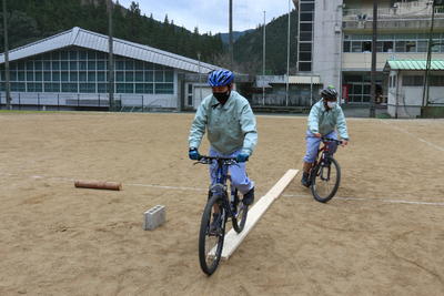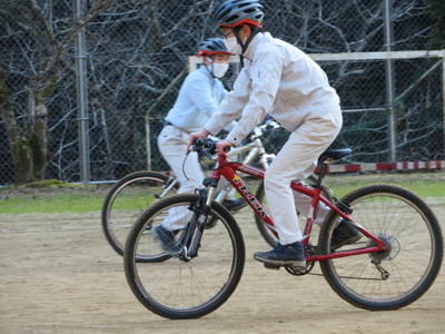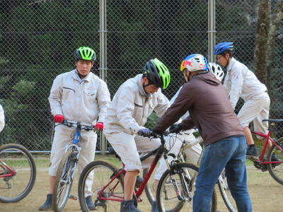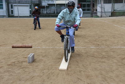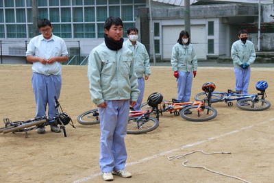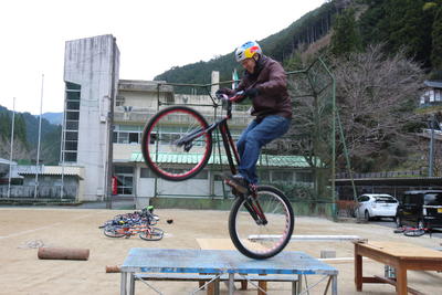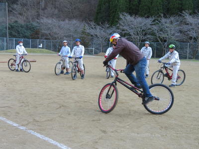 実演後は、生徒全員でトライアルに挑戦しました!!高台から飛んだりはできませんでしたが、自転車で止まるなど、基礎的なことはできるようになったようでした!!!